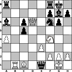 game notation in PGN-format [Event "Herbstturnier"] [Site "www.myChess.de"] [Date "2004.11.18"] [Round "1"] [White "Knight"] [Black "Joschi"] [ECO "A57"] [WhitemyELO "1205"] [BlackmyELO "1607"] [Result "0-1"] [TimeControl "10/864000"] [WhiteDays "19"] [BlackDays "18"] [MyChessNo "8175"] 1. d4 Nf6 2. c4 c5 3. d5 b5 4. cxb5 a6 5. e3 g6 6. Bc4 axb5 7. Bxb5 Qa5+ 8. Nc3 Bg7 9. d6 exd6 10. Nge2 O-O 11. Bd2 Bb7 12. O-O Qb6 13. a4 Nc6 14. Nf4 Ba6 15. Bxc6 dxc6 16. Re1 Qxb2 17. Rb1 Qa3 18. Bc1 Qxc3 19. Qxd6 Qxe1# 0-1 position notation in FEN-format r4rk1/5pbp/b1pQ1np1/2p5/P4N2/4P3/5PPP/1RB1q1K1 - - - 0 20 Captured white pieces: Captured black pieces: Click on a captured piece in order to display the desired move!