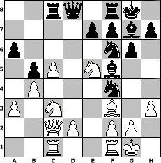 game notation in PGN-format [Event "4. Norderstedter DENK MAL Open 2013"] [Site "www.myChess.de"] [Date "2013.01.09"] [Round "1"] [White "Tomino"] [Black "Papale"] [ECO "A40"] [WhitemyELO "1736"] [BlackmyELO "1609"] [Result "0-1"] [TimeControl "10/2592000"] [WhiteDays "03"] [BlackDays "20"] [MyChessNo "86075"] 1. d4 g6 2. Nf3 Bg7 3. Bf4 d6 4. e3 Nf6 5. h3 O-O 6. c4 Na6 7. Nc3 c5 8. Be2 Rb8 9. O-O Bd7 10. a3 cxd4 11. exd4 Nc7 12. Rc1 b5 13. c5 dxc5 14. dxc5 Rc8 15. b4 a6 16. Ne5 Ne6 17. Qc2 Nxf4 18. Bf3 Bf5 0-1 position notation in FEN-format 2rq1rk1/4ppbp/p4np1/1pP1Nb2/1P3n2/P1N2B1P/2QP1PP1/2R2RK1 - - - 2 19 Captured white pieces: Captured black pieces: Click on a captured piece in order to display the desired move!
