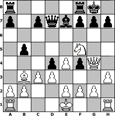 game notation in PGN-format [Event "M"] [Site "www.myChess.de"] [Date "2013.02.24"] [Round "1"] [White "frankto"] [Black "Rotstift10"] [ECO "C55"] [WhitemyELO "1732"] [BlackmyELO "1635"] [Result "1-0"] [TimeControl "10/3456000"] [WhiteDays "39"] [BlackDays "40"] [MyChessNo "86776"] 1. e4 e5 2. Nf3 Nc6 3. Bc4 Nf6 4. d3 Be7 5. c3 O-O 6. Bb3 d5 7. Nbd2 Bg4 8. h3 Bxf3 9. Qxf3 d4 10. Nf1 b5 11. Ng3 Qd7 12. Nf5 Nd8 13. Qg3 Nh5 14. Qg4 Ne6 15. Qxh5 Nf4 16. Bxf4 exf4 17. Qg4 1-0 position notation in FEN-format r4rk1/p1pqbppp/8/1p3N2/3pPpQ1/1BPP3P/PP2PPP1/R3K2R - KQ - 1 17 Captured white pieces: Captured black pieces: Click on a captured piece in order to display the desired move!