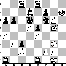game notation in PGN-format [Event "Modernes Benoni"] [Site "www.myChess.de"] [Date "2010.01.14"] [Round "2"] [White "Joschi"] [Black "reymund"] [ECO "A61"] [WhitemyELO "1570"] [BlackmyELO "1649"] [Result "1-0"] [TimeControl "10/2592000"] [WhiteDays "87"] [BlackDays "19"] [MyChessNo "62409"] 1. d4 Nf6 2. c4 c5 3. d5 e6 4. Nc3 exd5 5. cxd5 d6 6. Nf3 g6 7. Bg5 Bg7 8. e4 O-O 9. Bd3 Nbd7 10. O-O Re8 11. Re1 a6 12. a4 h6 13. Bf4 Ng4 14. h3 Nge5 15. Nxe5 dxe5 16. Be3 b6 17. Qd2 Nf6 18. Bxh6 Bxh6 19. Qxh6 Qd6 20. Ne2 c4 21. Bc2 Bd7 22. Ng3 Rac8 23. h4 c3 24. b3 Ng4 25. Qg5 Kh7 26. h5 Nf6 27. hxg6+ 1-0 position notation in FEN-format 2r1r3/3b1p1k/pp1q1nP1/3Pp1Q1/P3P3/1Pp3N1/2B2PP1/R3R1K1 - - - 0 27 Captured white pieces: Captured black pieces: Click on a captured piece in order to display the desired move!