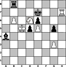game notation in PGN-format [Event "Corona hält uns am Computer"] [Site "www.myChess.de"] [Date "2020.05.17"] [Round "1"] [White "Grubengeist"] [Black "kalle"] [ECO "B55"] [WhitemyELO "2029"] [BlackmyELO "1652"] [Result "1-0"] [TimeControl "10/1728000"] [WhiteDays "20"] [BlackDays "20"] [MyChessNo "118319"] 1. e4 c5 2. Nf3 d6 3. d4 cxd4 4. Nxd4 Nf6 5. f3 e6 6. Be2 Be7 7. c4 O-O 8. O-O Nc6 9. Be3 d5 10. Nxc6 bxc6 11. e5 Nd7 12. f4 a5 13. Nc3 Bc5 14. Bxc5 Nxc5 15. Qd4 Qe7 16. Rac1 Na6 17. cxd5 cxd5 18. Nb5 f6 19. Nd6 fxe5 20. fxe5 Bd7 21. a3 Qg5 22. h4 Qe7 23. Bd3 Rxf1+ 24. Rxf1 Be8 25. g3 Bh5 26. Rc1 Nc7 27. Qb6 Ne8 28. Bb5 Qd8 29. Qxd8 Rxd8 30. Bxe8 Bxe8 31. b4 axb4 32. axb4 Bd7 33. b5 Rb8 34. Rb1 Rb6 35. Kf2 h6 36. Ke3 Kf8 37. Kd4 Ke7 38. Kc5 Rb8 39. b6 g5 40. hxg5 hxg5 41. Rh1 Ba4 42. Rh7+ 1-0 position notation in FEN-format 1r6/4k2R/1P1Np3/2KpP1p1/b7/6P1/8/8 - - - 3 42 Captured white pieces: Captured black pieces: Click on a captured piece in order to display the desired move!