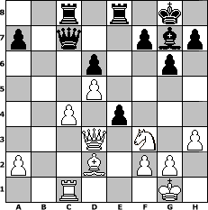 game notation in PGN-format [Event "Wintereinbruch"] [Site "www.myChess.de"] [Date "2015.10.18"] [Round "1"] [White "Seneca"] [Black "Joschi"] [ECO "A57"] [WhitemyELO "1480"] [BlackmyELO "1606"] [Result "0-1"] [TimeControl "10/1728000"] [WhiteDays "47"] [BlackDays "60"] [MyChessNo "100825"] 1. d4 Nf6 2. c4 c5 3. d5 b5 4. b3 bxc4 5. bxc4 g6 6. Nc3 Bg7 7. e4 Nxe4 8. Nxe4 Bxa1 9. Nxc5 Bg7 10. Bd2 O-O 11. Nf3 d6 12. Ne4 Bf5 13. Bd3 Nd7 14. O-O Rc8 15. Qc2 Bxe4 16. Bxe4 Nf6 17. Re1 Nxe4 18. Qxe4 Re8 19. Qd3 Qc7 20. Rc1 e5 21. h3 e4 0-1 position notation in FEN-format 2r1r1k1/p1q2pbp/3p2p1/3P4/2P1p3/3Q1N1P/P2B1PP1/2R3K1 - - - 0 22 Captured white pieces: Captured black pieces: Click on a captured piece in order to display the desired move!