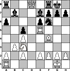 game notation in PGN-format [Event "FSO1-1-45"] [Site "www.myChess.de"] [Date "2005.05.26"] [Round "1"] [White "Hobbykegler"] [Black "Wormatia08"] [ECO "B50"] [WhitemyELO "1047"] [BlackmyELO "1350"] [Result "1-0"] [TimeControl "10/2592000"] [WhiteDays "28"] [BlackDays "00"] [MyChessNo "13580"] 1. e4 c5 2. Nf3 d6 3. Bc4 Nf6 4. Nc3 Nc6 5. O-O e6 6. Re1 Be7 7. d3 O-O 8. Bf4 a6 9. b3 b5 10. e5 dxe5 11. Nxe5 Nxe5 12. Rxe5 bxc4 13. dxc4 Bb7 14. Qxd8 1-0 position notation in FEN-format r2Q1rk1/1b2bppp/p3pn2/2p1R3/2P2B2/1PN5/P1P1PPPP/R5K1 - - - 0 14 Captured white pieces: Captured black pieces: Click on a captured piece in order to display the desired move!