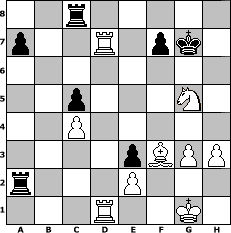 game notation in PGN-format [Event "Nuevo Relax 2010"] [Site "www.myChess.de"] [Date "2010.09.02"] [Round "1"] [White "guinan"] [Black "beowulf"] [ECO "A00"] [WhitemyELO "1696"] [BlackmyELO "1373"] [Result "1-0"] [TimeControl "10/3456000"] [WhiteDays "144"] [BlackDays "151"] [MyChessNo "68099"] 1. g3 d5 2. Bg2 Nf6 3. Nf3 c5 4. d3 Nc6 5. Nbd2 e5 6. O-O Bg4 7. h3 Bxf3 8. Nxf3 e4 9. Nh4 Bd6 10. dxe4 dxe4 11. Nf5 Be5 12. Nxg7+ Kf8 13. Nf5 Nd4 14. Bh6+ Ke8 15. Ng7+ Ke7 16. c3 Nc6 17. Qb3 Qc8 18. Rad1 Nd8 19. f4 Bc7 20. Bg5 Rg8 21. Bxf6+ Kf8 22. Nh5 Qf5 23. Bxd8 Bxd8 24. Qxb7 Rc8 25. Qd7 Qxd7 26. Rxd7 e3 27. Rfd1 Be7 28. c4 Rg6 29. f5 Rb6 30. Bf3 Rxb2 31. f6 Bxf6 32. Nxf6 Rxa2 33. Nxh7+ Kg7 34. Ng5 1-0 position notation in FEN-format 2r5/p2R1pk1/8/2p3N1/2P5/4pBPP/r3P3/3R2K1 - - - 2 34 Captured white pieces: Captured black pieces: Click on a captured piece in order to display the desired move!