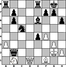 game notation in PGN-format [Event "Zwischendurch mal ein paar eigene Z"] [Site "www.myChess.de"] [Date "2009.06.25"] [Round "1"] [White "reisender"] [Black "Winston"] [ECO "C20"] [WhitemyELO "1369"] [BlackmyELO "1462"] [Result "0-1"] [TimeControl "10/1728000"] [WhiteDays "78"] [BlackDays "80"] [MyChessNo "56921"] 1. e4 e5 2. Be2 Bc5 3. Nf3 d6 4. d4 exd4 5. Nxd4 Nf6 6. Bf3 c6 7. Be3 O-O 8. O-O Re8 9. c3 d5 10. b4 Bf8 11. Nd2 h6 12. a3 dxe4 13. Be2 Qc7 14. f3 Bd6 15. g3 Bh3 16. f4 c5 17. Nc2 cxb4 18. Rf2 bxc3 19. Nb1 Na6 20. Nd4 Bd7 21. Bf1 Ng4 22. Re2 Nxe3 23. Rxe3 c2 24. Nxc2 Bc5 25. Nd4 Qb6 26. Kg2 Bxd4 27. Rb3 Qf6 28. Ra2 Be6 29. Rd2 Bb6 30. Rb5 Nc5 31. Rxb6 axb6 32. Rb2 Qxb2+ 0-1 position notation in FEN-format r3r1k1/1p3pp1/1p2b2p/2n5/4pP2/P5P1/1q4KP/1N1Q1B2 - - - 0 33 Captured white pieces: Captured black pieces: Click on a captured piece in order to display the desired move!