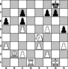 game notation in PGN-format [Event "Mal wieder spielen ?"] [Site "www.myChess.de"] [Date "2012.04.09"] [Round "1"] [White "Gauss1233"] [Black "borsti"] [ECO "A21"] [WhitemyELO "1246"] [BlackmyELO "1200"] [Result "1-0"] [TimeControl "10/2592000"] [WhiteDays "85"] [BlackDays "90"] [MyChessNo "81036"] 1. c4 e5 2. Nc3 Bb4 3. a3 Bxc3 4. bxc3 Nf6 5. d4 exd4 6. cxd4 d5 7. e3 Nc6 8. c5 Bf5 9. h3 Qe7 10. Bd3 Be4 11. Nf3 O-O 12. O-O a6 13. Bxe4 dxe4 14. Nd2 Nd5 15. Qb3 Rab8 16. Qxd5 Rfe8 17. Qa2 Qe6 18. Qxe6 Rxe6 19. d5 Rf6 20. Bb2 Rf5 21. dxc6 Rd8 22. Nxe4 bxc6 23. Rad1 Rdd5 24. g4 Rxd1 25. Rxd1 h5 26. gxf5 1-0 position notation in FEN-format 6k1/2p2pp1/p1p5/2P2P1p/4N3/P3P2P/1BP2P2/3R2K1 - - - 0 26 Captured white pieces: ![]() ![]() ![]() ![]() ![]() ![]() ![]() ![]() ![]() ![]() ![]() ![]() ![]() ![]() ![]() Captured black pieces: ![]() ![]() ![]() ![]() ![]() ![]() ![]() ![]() ![]() ![]() ![]() ![]() ![]() ![]() ![]() Click on a captured piece in order to display the desired move!