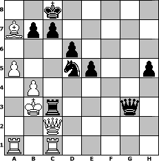 game notation in PGN-format [Event "Chess960 Open I 2014"] [Site "www.myChess.de"] [Date "2014.01.07"] [Round "1"] [White "Knight"] [Black "freizeitspieler"] [Variant "Fischerrandom"] [SetUp "1"] [FEN "rkqbbnrn/pppppppp/8/8/8/8/PPPPPPPP/RKQBBNRN w KQkq - 0 1"] [WhitemyELO "1243"] [BlackmyELO "1607"] [Result "0-1"] [TimeControl "10/3456000"] [WhiteDays "37"] [BlackDays "40"] [MyChessNo "92201"] 1. c3 f6 2. e4 e5 3. Nhg3 d6 4. Ne3 g6 5. Bb3 Rg7 6. d4 Bf7 7. d5 h5 8. h4 f5 9. exf5 Bxh4 10. fxg6 Bxg6+ 11. Bc2 Bxc2+ 12. Qxc2 Bxg3 13. fxg3 Rxg3 14. Bxg3 Qd8 15. Rh1 Qg5 16. Bf2 Nhg6 17. g3 O-O-O 18. a3 Nd7 19. b4 Rf8 20. Kb2 Ne7 21. a4 Nb6 22. a5 Nbxd5 23. Nxd5 Nxd5 24. Bxa7 Qxg3 25. Kb3 Rf3 26. Rhc1 Rxc3+ 0-1 position notation in FEN-format 2k5/Bpp5/3p4/P2np2p/1P6/1Kr3q1/2Q5/R1R5 - - - 0 27 Captured white pieces: Captured black pieces: Click on a captured piece in order to display the desired move!