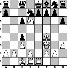 game notation in PGN-format [Event "Zwischendurch mal ein paar eigene Z"] [Site "www.myChess.de"] [Date "2009.02.11"] [Round "1"] [White "Master1"] [Black "Helmut48"] [ECO "D02"] [WhitemyELO "1280"] [BlackmyELO "1399"] [Result "1-0"] [TimeControl "10/1728000"] [WhiteDays "33"] [BlackDays "40"] [MyChessNo "52671"] 1. d4 d5 2. Nf3 h6 3. Nc3 c6 4. e4 dxe4 5. Nxe4 Bg4 6. h3 Bxf3 7. Qxf3 Qxd4 8. c3 Qd8 9. Bf4 Nd7 10. O-O-O Qc8 11. Bc4 b5 12. Rhe1 bxc4 13. Nd6+ 1-0 position notation in FEN-format r1q1kbnr/p2nppp1/2pN3p/8/2p2B2/2P2Q1P/PP1P1PP1/2KRR3 - kq - 1 13 Captured white pieces: Captured black pieces: Click on a captured piece in order to display the desired move!