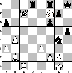 game notation in PGN-format [Event "Vor dem Urlaub noch ein schnelles Turnier!"] [Site "www.myChess.de"] [Date "2012.06.16"] [Round "1"] [White "Wernburger"] [Black "Winston"] [ECO "A13"] [WhitemyELO "1569"] [BlackmyELO "1489"] [Result "1-0"] [TimeControl "10/864000"] [WhiteDays "10"] [BlackDays "10"] [MyChessNo "82275"] 1. c4 e6 2. Nc3 a6 3. d4 h6 4. Nf3 Nf6 5. a3 d5 6. e3 Be7 7. cxd5 exd5 8. Qc2 O-O 9. Bd3 Bg4 10. Ne5 Bh5 11. Ne2 Bxe2 12. Bxe2 Bd6 13. Nf3 Nbd7 14. O-O c5 15. dxc5 Nxc5 16. b4 Nce4 17. Bd3 Rc8 18. Qb1 Qd7 19. Bb2 Bxh2+ 20. Kxh2 Ng4+ 21. Kg1 Qd6 22. Bxe4 dxe4 23. Qxe4 h5 24. Qxb7 Rb8 25. Qa7 f6 26. Rad1 Qc6 27. Rd7 Qxd7 28. Qxd7 Kh8 29. Ng5 Nh6 30. Rc1 Rbd8 31. Qc7 Ng4 32. Nf7+ 1-0 position notation in FEN-format 3r1r1k/2Q2Np1/p4p2/7p/1P4n1/P3P3/1B3PP1/2R3K1 - - - 8 32 Captured white pieces: Captured black pieces: Click on a captured piece in order to display the desired move!