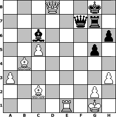 game notation in PGN-format [Event "Einfach nur Schach 2"] [Site "www.myChess.de"] [Date "2023.07.13"] [Round "1"] [White "faustballer"] [Black "beowulf"] [ECO "B20"] [WhitemyELO "1556"] [BlackmyELO "1463"] [Result "1-0"] [TimeControl "10/864000"] [WhiteDays "60"] [BlackDays "58"] [MyChessNo "130336"] 1. e4 c5 2. c4 e5 3. Nc3 Nc6 4. a3 Nf6 5. d3 Nd4 6. h3 d6 7. Nge2 Be7 8. Nxd4 cxd4 9. Nb1 O-O 10. Be2 b6 11. Bg5 h6 12. Bh4 g5 13. Bg3 Ba6 14. Nd2 b5 15. b3 bxc4 16. dxc4 Bb7 17. Bf3 Qa5 18. O-O Nd7 19. Qc2 Rfc8 20. b4 Qa6 21. Rfe1 Qb6 22. Qd3 a5 23. Reb1 axb4 24. Rxb4 Qa6 25. Bg4 Rc7 26. Bf3 Nc5 27. Qf1 Bc6 28. Qb1 Rb7 29. Be2 Rab8 30. Rxb7 Rxb7 31. Qc1 Nxe4 32. Nxe4 Bxe4 33. f3 Bc6 34. Be1 Qa8 35. Bb4 d5 36. c5 e4 37. Qd1 d3 38. Bf1 Bb5 39. Qd2 d4 40. fxe4 Bc6 41. Bxd3 Qd8 42. Re1 f6 43. Bc2 Rd7 44. Qd3 Qc7 45. e5 Bd8 46. exf6 Bxf6 47. Qg6+ Rg7 48. Qxf6 Qg3 49. Qf2 Qc7 50. Qxd4 Qf7 51. Qd8+ 1-0 position notation in FEN-format 3Q2k1/5qr1/2b4p/2P3p1/1B6/P6P/2B3P1/4R1K1 - - - 2 51 Captured white pieces: Captured black pieces: Click on a captured piece in order to display the desired move!