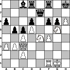 game notation in PGN-format [Event "CAISSA.COM IS DEAD TO ME!"] [Site "www.myChess.de"] [Date "2020.03.28"] [Round "2"] [White "iamnothere"] [Black "Joschi"] [ECO "A15"] [WhitemyELO "1447"] [BlackmyELO "1607"] [Result "0-1"] [TimeControl "10/2592000"] [WhiteDays "30"] [BlackDays "30"] [MyChessNo "117732"] 1. c4 Nf6 2. Nf3 g6 3. b3 Bg7 4. Bb2 c5 5. g3 O-O 6. Bg2 Nc6 7. O-O d6 8. d3 a6 9. Nbd2 Qc7 10. a3 b5 11. d4 Bb7 12. d5 Na7 13. e4 Rad8 14. h4 h5 15. e5 Ng4 16. exd6 exd6 17. Bxg7 Kxg7 18. Ng5 Nc8 19. Bh3 Nf6 20. f4 Ne7 21. g4 hxg4 22. Bxg4 Nxg4 23. Qxg4 Nf5 24. h5 Ne3 25. h6+ Kh8 26. Qf3 Nxf1 27. Rxf1 Bc8 28. Qc3+ f6 29. Nde4 Qe7 0-1 position notation in FEN-format 2br1r1k/4q3/p2p1ppP/1ppP2N1/2P1NP2/PPQ5/2P5/5RK1 - - - 2 30 Captured white pieces: Captured black pieces: Click on a captured piece in order to display the desired move!