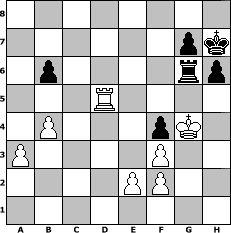 | game notation in PGN-format [Event "Sommersonnenwende"] [Site "www.myChess.de"] [Date "2007.06.15"] [Round "1"] [White "andreas007"] [Black "lure"] [ECO "C50"] [WhitemyELO "1468"] [BlackmyELO "1449"] [Result "1/2-1/2"] [TimeControl "10/1728000"] [WhiteDays "59"] [BlackDays "79"] [MyChessNo "35736"] 1. e4 e5 2. Nf3 Nc6 3. Bc4 h6 4. O-O Nf6 5. Re1 Bc5 6. c3 O-O 7. d4 exd4 8. cxd4 Bb6 9. Nc3 d6 10. Nd5 Nxd5 11. Bxd5 Qe8 12. a3 Bg4 13. Be3 Kh7 14. e5 dxe5 15. h3 exd4 16. Qd3+ Kh8 17. Bxd4 Qd7 18. Bxb6 axb6 19. hxg4 Qxg4 20. Nh2 Qd4 21. Qxd4 Nxd4 22. Bxb7 Rab8 23. Be4 f5 24. Bd3 c5 25. Nf3 Nxf3+ 26. gxf3 f4 27. Kh2 Rbd8 28. Rad1 Rf6 29. Rd2 c4 30. Red1 Rxd3 31. Rxd3 cxd3 32. Rxd3 Kh7 33. b4 Kg6 34. Rd5 Rc6 35. Kh3 Kh7 36. Kg4 Rg6+ 1/2-1/2 position notation in FEN-format 8/6pk/1p4rp/3R4/1P3pK1/P4P2/4PP2/8 - - - 7 37 Captured white pieces:                              Captured black pieces:                               Click on a captured piece in order to display the desired move!