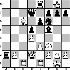 game notation in PGN-format [Event "2. Norderstedter DENK MAL Open 2011"] [Site "www.myChess.de"] [Date "2011.06.02"] [Round "1"] [White "Steffi"] [Black "Steppenwolf"] [ECO "D10"] [WhitemyELO "1512"] [BlackmyELO "1132"] [Result "1-0"] [TimeControl "10/2592000"] [WhiteDays "25"] [BlackDays "27"] [MyChessNo "74296"] 1. d4 d5 2. c4 c6 3. e3 Nf6 4. Nc3 Bf5 5. Nf3 e6 6. Be2 Bb4 7. O-O O-O 8. cxd5 cxd5 9. Bd2 Nc6 10. Rc1 Re8 11. Re1 Qd7 12. Bb5 a6 13. Ba4 b5 14. Nxb5 Bxd2 15. Qxd2 axb5 16. Bxb5 Rxa2 17. Bxc6 1-0 position notation in FEN-format 4r1k1/3q1ppp/2B1pn2/3p1b2/3P4/4PN2/rP1Q1PPP/2R1R1K1 - - - 0 17 Captured white pieces: ![]() ![]() ![]() ![]() ![]() ![]() ![]() ![]() ![]() ![]() ![]() ![]() ![]() ![]() ![]() Captured black pieces: ![]() ![]() ![]() ![]() ![]() ![]() ![]() ![]() ![]() ![]() ![]() ![]() ![]() ![]() ![]() Click on a captured piece in order to display the desired move!