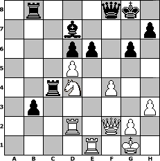 game notation in PGN-format [Event "Schach dem Nikolaus VII"] [Site "www.myChess.de"] [Date "2020.11.23"] [Round "1"] [White "Ziegert"] [Black "jeremyt"] [ECO "C60"] [WhitemyELO "2104"] [BlackmyELO "2097"] [Result "1/2-1/2"] [TimeControl "10/2592000"] [WhiteDays "27"] [BlackDays "30"] [MyChessNo "119995"] 1. e4 e5 2. Nf3 Nc6 3. Bb5 Nge7 4. O-O g6 5. c3 a6 6. Ba4 Bg7 7. d4 exd4 8. cxd4 b5 9. Bb3 O-O 10. Nc3 d6 11. h3 Na5 12. Bc2 c5 13. d5 Nc4 14. Bd3 Ne5 15. Nxe5 Bxe5 16. Bh6 Re8 17. Qd2 c4 18. Bc2 Bd7 19. Bf4 Nc8 20. Bg5 Bf6 21. Bxf6 Qxf6 22. a3 Qg7 23. Rab1 a5 24. Ne2 Nb6 25. Rfd1 Qf6 26. f4 Qd8 27. Nd4 Qf6 28. Ne2 Qg7 29. Nd4 Rec8 30. Qc3 Ra6 31. Rd2 Raa8 32. Rf1 Rab8 33. Qg3 b4 34. axb4 axb4 35. b3 cxb3 36. Bxb3 Rc3 37. Qf2 Nc4 38. Bxc4 Rxc4 39. e5 b3 40. Re1 Qf8 41. e6 fxe6 1/2-1/2 position notation in FEN-format 1r3qk1/3b3p/3pp1p1/3P4/2rN1P2/1p5P/3R1QP1/4R1K1 - - - 0 42 Captured white pieces: ![]() ![]() ![]() ![]() ![]() ![]() ![]() ![]() ![]() ![]() ![]() ![]() ![]() ![]() ![]() Captured black pieces: ![]() ![]() ![]() ![]() ![]() ![]() ![]() ![]() ![]() ![]() ![]() ![]() ![]() ![]() ![]() Click on a captured piece in order to display the desired move!