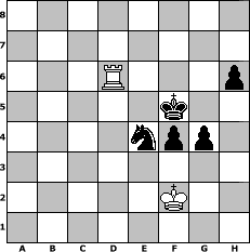 game notation in PGN-format [Event "Spa"] [Site "www.myChess.de"] [Date "2008.10.21"] [Round "1"] [White "Hobbykegler"] [Black "Master1"] [ECO "A35"] [WhitemyELO "1129"] [BlackmyELO "1252"] [Result "0-1"] [TimeControl "10/2592000"] [WhiteDays "197"] [BlackDays "194"] [MyChessNo "48955"] 1. c4 c5 2. Nc3 Nc6 3. b3 e5 4. Bb2 f5 5. Nf3 e4 6. Nd5 exf3 7. gxf3 Nce7 8. Nxe7 Nxe7 9. Bh3 d6 10. Qc2 g6 11. O-O-O Rg8 12. e4 b6 13. d4 f4 14. Bxc8 Qxc8 15. dxc5 dxc5 16. Rhe1 Bg7 17. Bxg7 Rxg7 18. e5 Qc7 19. e6 Rd8 20. Rxd8+ Qxd8 21. Rd1 Qc8 22. Qd2 g5 23. Qd7+ Qxd7 24. exd7+ Kd8 25. a3 Nf5 26. Rd5 Nh4 27. h3 Nxf3 28. Kc2 Ng1 29. Kd3 Nxh3 30. Ke4 Nxf2+ 31. Kf5 Rxd7 32. Re5 h6 33. b4 Rd6 34. bxc5 bxc5 35. Rxc5 Kd7 36. a4 Nd3 37. Ra5 a6 38. c5 Rc6 39. Ke4 Nxc5+ 40. Kf3 Nb3 41. Rd5+ Ke6 42. Rd3 Nc5 43. Ra3 a5 44. Kg4 Rb6 45. Kf3 Rb4 46. Rc3 Rb3 47. Rxb3 Kf7 48. Rb5 Nxa4 49. Rxa5 Nc3 50. Rf5+ Kg6 51. Rc5 Na4 52. Rc6+ Kh5 53. Rc4 Nb6 54. Rb4 Nd5 55. Rd4 Ne3 56. Re4 Ng4 57. Re1 Nf6 58. Rh1+ Kg6 59. Rd1 Kf5 60. Rd6 g4+ 61. Kf2 Ne4+ 0-1 position notation in FEN-format 8/8/3R3p/5k2/4npp1/8/5K2/8 - - - 2 62 Captured white pieces: Captured black pieces: Click on a captured piece in order to display the desired move!