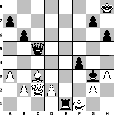 game notation in PGN-format [Event "Für die kalten Tage..."] [Site "www.myChess.de"] [Date "2018.02.09"] [Round "2"] [White "freizeitspieler"] [Black "Rotstift10"] [ECO "A45"] [WhitemyELO "1532"] [BlackmyELO "1579"] [Result "0-1"] [TimeControl "10/1728000"] [WhiteDays "20"] [BlackDays "18"] [MyChessNo "111366"] 1. d4 Nf6 2. Nc3 d5 3. e4 Nxe4 4. Nxe4 dxe4 5. f3 exf3 6. Nxf3 Qd5 7. c4 Qe4+ 8. Be2 e6 9. O-O c5 10. Bd3 Qg4 11. Qe1 Bd6 12. d5 O-O 13. Qd1 h6 14. Qc2 f5 15. dxe6 Bxe6 16. Be3 Nc6 17. a3 b6 18. h3 Qh5 19. Rae1 Bg3 20. Re2 Rf6 21. Bf2 f4 22. Be4 Rc8 23. Qa4 Nd4 24. Nxd4 cxd4 25. Bf3 Qg5 26. Bxd4 Bxc4 27. Re8+ Rxe8 28. Qxe8+ Rf8 29. Qa4 Bxf1 30. Kxf1 Qe7 31. Bc3 Qc5 32. Qc2 Re8 33. Be4 Rxe4 34. Qb3+ Kh8 35. Qc2 Re1+ 0-1 position notation in FEN-format 7k/p5p1/1p5p/2q5/5p2/P1B3bP/1PQP2P1/4rK2 - - - 4 36 Captured white pieces: Captured black pieces: Click on a captured piece in order to display the desired move!