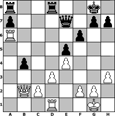 game notation in PGN-format [Event "f"] [Site "www.myChess.de"] [Date "2005.12.25"] [Round "1"] [White "Antaeus"] [Black "MichaelKnopf"] [ECO "A20"] [WhitemyELO "1493"] [BlackmyELO "1499"] [Result "1/2-1/2"] [TimeControl "10/864000"] [WhiteDays "10"] [BlackDays "10"] [MyChessNo "21155"] 1. c4 e5 2. e4 Nc6 3. d3 Nd4 4. Nc3 Bb4 5. a3 Be7 6. b4 c6 7. c5 d6 8. Nf3 Bg4 9. Be2 Nxe2 10. Qxe2 dxc5 11. h3 Bxf3 12. Qxf3 cxb4 13. axb4 Bxb4 14. Bb2 Qd4 15. Rc1 Ne7 16. O-O O-O 17. Rfd1 b5 18. Qe2 Bxc3 19. Bxc3 Qd6 20. Qb2 f6 21. Bb4 Qc7 22. Bxe7 Qxe7 23. Rxc6 b4 24. Ra6 Rfd8 1/2-1/2 position notation in FEN-format r2r2k1/p3q1pp/R4p2/4p3/1p2P3/3P3P/1QP2PP1/3R2K1 - - - 2 25 Captured white pieces: Captured black pieces: Click on a captured piece in order to display the desired move!