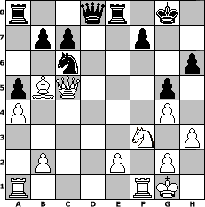 game notation in PGN-format [Event "\" Zum Ab-u.Angew"] [Site "www.myChess.de"] [Date "2012.08.06"] [Round "1"] [White "faustballer"] [Black "Knight"] [ECO "C24"] [WhitemyELO "1547"] [BlackmyELO "1044"] [Result "1-0"] [TimeControl "10/864000"] [WhiteDays "10"] [BlackDays "00"] [MyChessNo "83180"] 1. e4 e5 2. Bc4 Nf6 3. d3 Bc5 4. Bg5 d6 5. h3 O-O 6. a3 h6 7. Bh4 g5 8. Bg3 Nc6 9. c3 Re8 10. a4 a5 11. Nf3 Be6 12. Bb5 Qe7 13. O-O Kh7 14. d4 exd4 15. cxd4 Nxe4 16. dxc5 dxc5 17. Qc2 Bf5 18. Qc1 Nxg3 19. fxg3 Qd6 20. g4 Bxb1 21. Qxb1+ Kg8 22. Qc2 Qd8 23. Qxc5 1-0 position notation in FEN-format r2qr1k1/1pp2p2/2n4p/pBQ3p1/P5P1/5N1P/1P2P1P1/R4RK1 - - - 0 23 Captured white pieces: Captured black pieces: Click on a captured piece in order to display the desired move!
