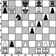 | game notation in PGN-format [Event "spass mit m"] [Site "www.myChess.de"] [Date "2005.03.21"] [Round "2"] [White "EduardM"] [Black "Sanji"] [ECO "A45"] [WhitemyELO "1433"] [BlackmyELO "1454"] [Result "1-0"] [TimeControl "10/3456000"] [WhiteDays "76"] [BlackDays "80"] [MyChessNo "11364"] 1. d4 Nf6 2. Nc3 g6 3. e4 d5 4. e5 Ne4 5. Nxe4 dxe4 6. Bc4 f5 7. c3 e6 8. Nh3 c5 9. O-O Nc6 10. Nf4 cxd4 11. Nxe6 Bxe6 12. Bxe6 dxc3 13. Qb3 cxb2 14. Bf7+ Kd7 15. Qxb7+ 1-0 position notation in FEN-format r2q1b1r/pQ1k1B1p/2n3p1/4Pp2/4p3/8/Pp1P1PPP/R1B2RK1 - - - 0 15 Captured white pieces:                              Captured black pieces:                               Click on a captured piece in order to display the desired move!