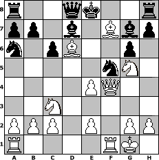game notation in PGN-format [Event "Rund ums K"] [Site "www.myChess.de"] [Date "2004.09.28"] [Round "2"] [White "PublicEnemy"] [Black "OwainGwynedd"] [ECO "C30"] [WhitemyELO "1301"] [BlackmyELO "1211"] [Result "1-0"] [TimeControl "10/2592000"] [WhiteDays "42"] [BlackDays "59"] [MyChessNo "7172"] 1. e4 e5 2. f4 d6 3. Bc4 f6 4. Nh3 Nh6 5. d3 g6 6. Nc3 c6 7. d4 Qe7 8. dxe5 fxe5 9. O-O Bg7 10. Ng5 exf4 11. Bxf4 Na6 12. Bxd6 Qd8 13. Qd2 Bd7 14. Qf4 Nf5 15. Bf7# 1-0 position notation in FEN-format r2qk2r/pp1b1Bbp/n1pB2p1/5nN1/4PQ2/2N5/PPP1P1PP/R4RK1 - kq - 6 15 Captured white pieces: ![]() ![]() ![]() ![]() ![]() ![]() ![]() ![]() ![]() ![]() ![]() ![]() ![]() ![]() ![]() Captured black pieces: ![]() ![]() ![]() ![]() ![]() ![]() ![]() ![]() ![]() ![]() ![]() ![]() ![]() ![]() ![]() Click on a captured piece in order to display the desired move!