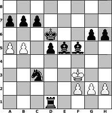game notation in PGN-format [Event "Novemberturnier"] [Site "www.myChess.de"] [Date "2004.11.04"] [Round "1"] [White "Master1"] [Black "NoBody"] [ECO "A41"] [WhitemyELO "1217"] [BlackmyELO "1781"] [Result "0-1"] [TimeControl "10/2592000"] [WhiteDays "120"] [BlackDays "120"] [MyChessNo "7767"] 1. d4 d6 2. e4 Nf6 3. Nc3 g6 4. e5 dxe5 5. dxe5 Qxd1+ 6. Nxd1 Nd5 7. c4 Nb4 8. Ne3 N8c6 9. a3 Na6 10. b4 Nxe5 11. b5 Nc5 12. Bb2 Ncd3+ 13. Bxd3 Nxd3+ 14. Ke2 Nxb2 15. Rb1 Bg7 16. Nd5 Kd8 17. Nf3 e6 18. Ng5 exd5 19. Nxf7+ Ke7 20. Nxh8 Bxh8 21. Rbe1 Nxc4 22. Kd3+ Kd6 23. Re8 Bf5+ 24. Ke2 Rxe8+ 25. Kf3 Nd2+ 26. Kf4 h6 27. Rd1 Re4+ 28. Kg3 Rg4+ 29. Kh3 Rd4+ 30. Kg3 Ne4+ 31. Kf3 Rxd1 32. a4 Nc3 33. a5 Be5 0-1 position notation in FEN-format 8/ppp5/3k2pp/PP1pbb2/8/2n2K2/5PPP/3r4 - - - 1 34 Captured white pieces: Captured black pieces: Click on a captured piece in order to display the desired move!