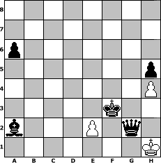 game notation in PGN-format [Event "> 1500"] [Site "www.myChess.de"] [Date "2010.03.18"] [Round "1"] [White "gunni50"] [Black "Caligula"] [ECO "C50"] [WhitemyELO "1307"] [BlackmyELO "1318"] [Result "0-1"] [TimeControl "10/2592000"] [WhiteDays "141"] [BlackDays "150"] [MyChessNo "64119"] 1. e4 e5 2. Nf3 Nc6 3. Bc4 h6 4. O-O Nf6 5. Nc3 Bb4 6. d3 Bxc3 7. bxc3 d5 8. exd5 Nxd5 9. Bxd5 Qxd5 10. Bb2 O-O 11. Qd2 Be6 12. c4 Qd6 13. Rae1 f5 14. Qc3 Rae8 15. Ba3 Qd4 16. Qxd4 Nxd4 17. Nxd4 exd4 18. Bxf8 Kxf8 19. f4 Kf7 20. Rc1 c5 21. c3 dxc3 22. Rxc3 Rd8 23. Ra3 a6 24. Ra5 Rc8 25. Rd1 Rc7 26. d4 cxd4 27. Rxd4 Ke7 28. Kf2 g6 29. Kf3 Bxc4 30. Re5+ Kf7 31. g4 fxg4+ 32. Kxg4 Bxa2 33. f5 Kf6 34. Rd6+ Kxe5 35. Rxg6 Rc4+ 36. Kf3 Rf4+ 37. Kg3 h5 38. Rg5 Rxf5 39. Rxf5+ Kxf5 40. h4 b5 41. Kf3 b4 42. Kg3 b3 43. Kh3 b2 44. Kh2 b1=Q 45. Kg3 Ke4 46. Kh3 Kf3 47. Kh2 Qb2+ 48. Kh1 Qg2# 0-1 position notation in FEN-format 8/8/p7/7p/7P/5k2/b3P1q1/7K - - - 8 49 Captured white pieces: Captured black pieces: Click on a captured piece in order to display the desired move!