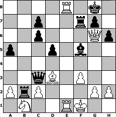 game notation in PGN-format [Event "9er4"] [Site "www.myChess.de"] [Date "2014.01.18"] [Round "1"] [White "spiderman"] [Black "Duschgel"] [ECO "A00"] [WhitemyELO "1640"] [BlackmyELO "1666"] [Result "1-0"] [TimeControl "10/3456000"] [WhiteDays "38"] [BlackDays "35"] [MyChessNo "92394"] 1. Nc3 Nf6 2. e4 e5 3. Nf3 Nc6 4. Bb5 d6 5. d4 exd4 6. Nxd4 Bd7 7. Nxc6 bxc6 8. Bc4 Be7 9. O-O O-O 10. Bf4 a5 11. e5 Ng4 12. e6 fxe6 13. Qxg4 d5 14. Be5 Bf6 15. Bxf6 Qxf6 16. Bd3 Rf7 17. Qh3 h6 18. Qh5 e5 19. f3 Rb8 20. Rae1 Rxb2 21. Rxe5 Qf4 22. Rfe1 Qd4+ 23. Kf1 Qxc3 24. Qg6 Bf5 25. Re8+ 1-0 position notation in FEN-format 4R1k1/2p2rp1/2p3Qp/p2p1b2/8/2qB1P2/PrP3PP/1N2RK2 - - - 3 25 Captured white pieces: Captured black pieces: Click on a captured piece in order to display the desired move!