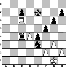game notation in PGN-format [Event "Schlusslichterturnier Nr.2"] [Site "www.myChess.de"] [Date "2010.10.25"] [Round "1"] [White "Seneca"] [Black "sprinterde"] [ECO "A40"] [WhitemyELO "1483"] [BlackmyELO "1595"] [Result "0-1"] [TimeControl "10/2592000"] [WhiteDays "28"] [BlackDays "30"] [MyChessNo "69302"] 1. d4 e6 2. c4 Nf6 3. Nc3 Bb4 4. Bd2 d5 5. cxd5 Nxd5 6. Nxd5 Bxd2+ 7. Qxd2 Qxd5 8. Nf3 O-O 9. e3 Nc6 10. b3 Rd8 11. Bc4 Qf5 12. O-O a5 13. a3 e5 14. Qb2 e4 15. Nd2 Be6 16. Bxe6 Qxe6 17. Qc2 f5 18. Rab1 Rd7 19. a4 Nb4 20. Qc4 Re8 21. Qxe6+ Rxe6 22. Nc4 Rd5 23. g3 g6 24. Rbc1 Nd3 25. Rc3 Rc6 26. Kg2 b5 27. axb5 Rxb5 28. Ra1 Nb4 29. Ra4 Nd5 30. Rc2 Nb6 31. Raa2 Nd5 32. Nd2 Rcb6 33. Ra4 Rb7 34. Rac4 Kf7 35. Rc5 R7b6 36. Nc4 Rxc5 37. Ne5+ Ke6 38. Rxc5 Rxb3 39. Rxa5 Rb2 40. Ra6+ Rb6 41. Ra7 Rb2 42. Ra6+ Ke7 43. Nc4 Rc2 44. Rc6 Nxe3+ 45. Kg1 Rxc4 0-1 position notation in FEN-format 8/2p1k2p/2R3p1/5p2/2rPp3/4n1P1/5P1P/6K1 - - - 0 46 Captured white pieces: Captured black pieces: Click on a captured piece in order to display the desired move!