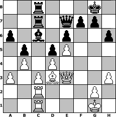 game notation in PGN-format [Event "Nach dem Weltuntergang 2012"] [Site "www.myChess.de"] [Date "2012.12.27"] [Round "1"] [White "Stecher1966"] [Black "Joschi"] [ECO "B13"] [WhitemyELO "1501"] [BlackmyELO "1562"] [Result "1/2-1/2"] [TimeControl "10/864000"] [WhiteDays "09"] [BlackDays "09"] [MyChessNo "85689"] 1. e4 c6 2. d4 d5 3. exd5 cxd5 4. h3 Nf6 5. Nf3 Nc6 6. c3 a6 7. Bd3 b5 8. a3 Bb7 9. O-O e6 10. Bf4 Bd6 11. Bg5 h6 12. Bh4 Rc8 13. Nbd2 Be7 14. Re1 O-O 15. Ne5 Nd7 16. Bxe7 Qxe7 17. Ndf3 Ndxe5 18. Nxe5 Na5 19. f4 Nc4 20. Qe2 Qd6 21. b3 Nxe5 22. fxe5 Qd7 23. Rac1 Rc7 24. Rc2 Rfc8 25. Rec1 Qe7 26. b4 Bc6 27. Qe3 1/2-1/2 position notation in FEN-format 2r3k1/2r1qpp1/p1b1p2p/1p1pP3/1P1P4/P1PBQ2P/2R3P1/2R3K1 - - - 2 27 Captured white pieces: Captured black pieces: Click on a captured piece in order to display the desired move!