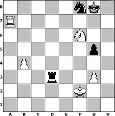 game notation in PGN-format [Event "Rechnerfrei A"] [Site "www.myChess.de"] [Date "2010.02.05"] [Round "1"] [White "hape50"] [Black "Steppenwolf"] [ECO "D00"] [WhitemyELO "1276"] [BlackmyELO "1245"] [Result "1-0"] [TimeControl "10/1728000"] [WhiteDays "80"] [BlackDays "36"] [MyChessNo "62916"] 1. d4 d5 2. e3 Nc6 3. h3 Nf6 4. Nf3 Bf5 5. Bd3 Bxd3 6. Qxd3 e6 7. Nc3 Bb4 8. Bd2 O-O 9. a3 Ba5 10. e4 Re8 11. O-O dxe4 12. Nxe4 Nxe4 13. Bxa5 Nxa5 14. Qxe4 Nc6 15. h4 Qd7 16. Ng5 f5 17. Qd3 Qxd4 18. Qxd4 Nxd4 19. c3 Ne2+ 20. Kh2 e5 21. Rae1 Nf4 22. Rd1 Rad8 23. g3 Rxd1 24. Rxd1 e4 25. Rd7 e3 26. fxe3 Ng6 27. Rxc7 Rxe3 28. Rc8+ Nf8 29. b4 h6 30. Nh3 Re2+ 31. Kg1 Re1+ 32. Kf2 Ra1 33. Rb8 Rxa3 34. Rxb7 Rxc3 35. Rxa7 f4 36. Nxf4 g5 37. hxg5 hxg5 38. Nd5 Rd3 39. Nf6+ 1-0 position notation in FEN-format 5nk1/R7/5N2/6p1/1P6/3r2P1/5K2/8 - - - 3 39 Captured white pieces: Captured black pieces: Click on a captured piece in order to display the desired move!