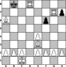 game notation in PGN-format [Event "Faires Schach"] [Site "www.myChess.de"] [Date "2007.03.25"] [Round "1"] [White "Andreas"] [Black "paul"] [ECO "C41"] [WhitemyELO "1619"] [BlackmyELO "1329"] [Result "1-0"] [TimeControl "10/3456000"] [WhiteDays "113"] [BlackDays "075"] [MyChessNo "33729"] 1. e4 e5 2. Nf3 d6 3. d4 Nf6 4. dxe5 dxe5 5. Qxd8+ Kxd8 6. Nxe5 Be6 7. Nc3 Bd6 8. Nd3 Nfd7 9. Bd2 Ne5 10. O-O-O Bc4 11. Be3 b6 12. Nxe5 Be6 13. Nb5 Rf8 14. Nxd6 cxd6 15. Rxd6+ Nd7 16. Nxd7 Bxd7 17. Bb5 Kc7 18. Rxd7+ Kc8 19. Bc6 Rb8 20. Rxa7 b5 21. Bd7+ Kd8 22. Rd1 f6 23. Bxb5+ Kc8 24. Ba6+ Rb7 25. Rxb7 Rd8 26. Rxg7+ Kb8 27. Rxd8# 1-0 position notation in FEN-format 1k1R4/6Rp/B4p2/8/4P3/4B3/PPP1PPPP/2K5 - - - 0 27 Captured white pieces: Captured black pieces: Click on a captured piece in order to display the desired move!