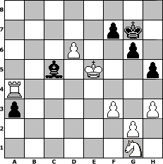 game notation in PGN-format [Event ""Gehirn Jogging A""] [Site "www.myChess.de"] [Date "2010.04.28"] [Round "2"] [White "neve"] [Black "Pinguin"] [ECO "A09"] [WhitemyELO "1438"] [BlackmyELO "1557"] [Result "1-0"] [TimeControl "10/1728000"] [WhiteDays "20"] [BlackDays "18"] [MyChessNo "65119"] 1. Nf3 d5 2. c4 e6 3. d4 Nf6 4. Nc3 Be7 5. e3 O-O 6. a3 Ne4 7. cxd5 exd5 8. Bd3 Nxc3 9. bxc3 Nc6 10. Qc2 g6 11. c4 dxc4 12. Bxc4 Bg4 13. Be2 Re8 14. h3 Bf5 15. Qc3 Qd6 16. Bb2 Bf6 17. Bd3 Bxd3 18. Qxd3 Re6 19. Rb1 Rae8 20. Rd1 Ne7 21. d5 Nxd5 22. Qxd5 Qxd5 23. Rxd5 Bxb2 24. Rb5 Bxa3 25. Rxb7 a5 26. Rxc7 Bb4+ 27. Ke2 a4 28. Ra7 a3 29. Nd4 Rd6 30. Rc1 Kf8 31. Rc2 Rxd4 32. Rcc7 Re7 33. Rc8+ Re8 34. Rxe8+ Kxe8 35. exd4 Kf8 36. Kd3 Kg7 37. Kc4 Bd6 38. Kd5 Bb4 39. Ke5 Be1 40. f3 Bb4 41. d5 Bc5 42. Ra4 h5 43. d6 1-0 position notation in FEN-format 8/5pk1/3P2p1/2b1K2p/R7/p4P1P/6P1/6N1 - - - 0 43 Captured white pieces: Captured black pieces: Click on a captured piece in order to display the desired move!