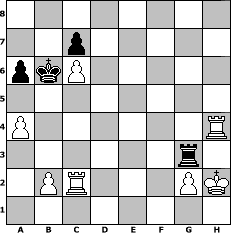 game notation in PGN-format [Event "Sommerschach"] [Site "www.myChess.de"] [Date "2018.05.26"] [Round "1"] [White "alpacino"] [Black "Schefsche"] [ECO "D02"] [WhitemyELO "1317"] [BlackmyELO "1330"] [Result "1-0"] [TimeControl "10/2592000"] [WhiteDays "30"] [BlackDays "30"] [MyChessNo "112194"] 1. d4 d5 2. Nf3 Bg4 3. Ne5 Nf6 4. Nxg4 Nxg4 5. h3 Nf6 6. e3 e6 7. Bd2 a6 8. Bd3 Nc6 9. Nc3 Ne4 10. Bxe4 dxe4 11. Nxe4 Bb4 12. c3 Ba5 13. Nc5 b6 14. Nb3 Qd5 15. O-O h5 16. Qc1 g5 17. c4 Qd6 18. c5 bxc5 19. dxc5 Qe5 20. Bxa5 O-O-O 21. Bc3 Qf5 22. Bxh8 Rxh8 23. Nd4 Nxd4 24. exd4 h4 25. Qe3 g4 26. Qe2 Kb7 27. c6+ Ka7 28. Qe3 Qd5 29. Rfc1 gxh3 30. Qxh3 Qxd4 31. Qe3 e5 32. Rd1 Qxe3 33. fxe3 Rh6 34. Rdc1 Rg6 35. Rc2 f5 36. a4 f4 37. exf4 exf4 38. Rf1 Rg4 39. Kh2 Rg3 40. Rxf4 Kb6 41. Rxh4 1-0 position notation in FEN-format 8/2p5/pkP5/8/P6R/6r1/1PR3PK/8 - - - 0 41 Captured white pieces: Captured black pieces: Click on a captured piece in order to display the desired move!