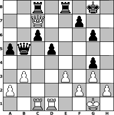 game notation in PGN-format [Event "fr"] [Site "www.myChess.de"] [Date "2011.10.14"] [Round "1"] [White "retep1"] [Black "HenrySchinasky"] [ECO "A46"] [WhitemyELO "1735"] [BlackmyELO "2099"] [Result "1/2-1/2"] [TimeControl "10/1728000"] [WhiteDays "20"] [BlackDays "20"] [MyChessNo "76813"] 1. d4 Nf6 2. Nf3 d5 3. g3 g6 4. Bg2 Bg7 5. O-O O-O 6. c4 c6 7. cxd5 cxd5 8. Nc3 Nc6 9. Ne5 Bf5 10. Be3 Qb6 11. Nxc6 bxc6 12. Na4 Qb5 13. b3 Rfe8 14. Rc1 Nd7 15. Qd2 Rac8 16. Nc5 a5 17. Bf3 e5 18. Nxd7 Bxd7 19. dxe5 Bxe5 20. Bd4 Bd6 21. Ba1 Be5 22. Bxe5 Rxe5 23. Rfd1 Ree8 24. Qd4 h5 25. Qa7 Bg4 26. Bxg4 hxg4 27. e3 Ra8 28. Qc7 Rac8 1/2-1/2 position notation in FEN-format 2r1r1k1/2Q2p2/2p3p1/pq1p4/6p1/1P2P1P1/P4P1P/2RR2K1 - - - 3 29 Captured white pieces: Captured black pieces: Click on a captured piece in order to display the desired move!