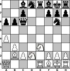 game notation in PGN-format [Event "5.FC 960-Clubmeisterschaft 2016"] [Site "www.myChess.de"] [Date "2016.01.09"] [Round "1"] [White "nyffhans"] [Black "Erich"] [Variant "Fischerrandom"] [SetUp "1"] [FEN "qnbnrbkr/pppppppp/8/8/8/8/PPPPPPPP/QNBNRBKR w KQkq - 0 1"] [WhitemyELO "1953"] [BlackmyELO "2108"] [Result "0-1"] [TimeControl "10/1728000"] [WhiteDays "00"] [BlackDays "20"] [MyChessNo "102057"] 1. d4 d5 2. Nd2 Nbc6 3. b3 e5 4. dxe5 Nxe5 5. e4 b6 6. exd5 Qxd5 7. Ne3 Qc6 8. a4 a6 9. Bb2 Ng6 0-1 position notation in FEN-format 2bnrbkr/2p2ppp/ppq3n1/8/P7/1P2N3/1BPN1PPP/Q3RBKR - KQkq - 2 10 Captured white pieces: Captured black pieces: Click on a captured piece in order to display the desired move!