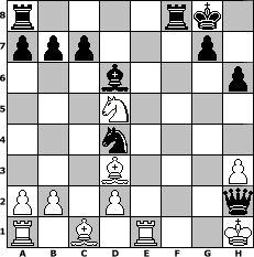 game notation in PGN-format [Event "1.Chess in Friendship"] [Site "www.myChess.de"] [Date "2004.08.10"] [Round "2"] [White "Hobbykegler"] [Black "Schili"] [ECO "A40"] [WhitemyELO "1103"] [BlackmyELO "1500"] [Result "0-1"] [TimeControl "10/2592000"] [WhiteDays "65"] [BlackDays "83"] [MyChessNo "6104"] 1. d4 e6 2. e4 d5 3. exd5 exd5 4. Be2 Nf6 5. Nf3 Nc6 6. O-O Bd6 7. c4 Be6 8. Re1 O-O 9. Ng5 Qd7 10. Bd3 h6 11. Nxe6 fxe6 12. cxd5 exd5 13. h4 Ng4 14. Nc3 Nxf2 15. Qe2 Nxd4 16. Qe3 Qg4 17. Nxd5 Qxh4 18. Qh3 Nxh3+ 19. gxh3 Qg3+ 20. Kh1 Qh2# 0-1 position notation in FEN-format r4rk1/ppp3p1/3b3p/3N4/3n4/3B3P/PP1P3q/R1B1R2K - - - 3 21 Captured white pieces: Captured black pieces: Click on a captured piece in order to display the desired move!
