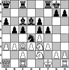 game notation in PGN-format [Event "960-Sommercup 2016"] [Site "www.myChess.de"] [Date "2016.06.10"] [Round "1"] [White "espero"] [Black "Erich"] [Variant "Fischerrandom"] [SetUp "1"] [FEN "qnrnbbkr/pppppppp/8/8/8/8/PPPPPPPP/QNRNBBKR w KQkq - 0 1"] [WhitemyELO "1831"] [BlackmyELO "2115"] [Result "0-1"] [TimeControl "10/2592000"] [WhiteDays "30"] [BlackDays "30"] [MyChessNo "103800"] 1. e4 e5 2. b3 Nbc6 3. Ne3 Ne6 4. Bc4 a6 5. Bxe6 dxe6 6. d3 Nd4 7. Nc3 b5 8. a3 c5 9. Kf1 Bc6 10. Ne2 Bd6 11. Bc3 O-O 12. f3 f5 0-1 position notation in FEN-format q1r2rk1/6pp/p1bbp3/1pp1pp2/3nP3/PPBPNP2/2P1N1PP/Q1R2K1R - - - 0 13 Captured white pieces: Captured black pieces: Click on a captured piece in order to display the desired move!
