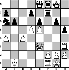 game notation in PGN-format [Event "960 iger Turnier zum 1.Mai"] [Site "www.myChess.de"] [Date "2018.05.01"] [Round "1"] [White "Cuibono"] [Black "Erich"] [Variant "Fischerrandom"] [SetUp "1"] [FEN "bqnbnrkr/pppppppp/8/8/8/8/PPPPPPPP/BQNBNRKR w KQkq - 0 1"] [WhitemyELO "2255"] [BlackmyELO "2124"] [Result "1-0"] [TimeControl "10/2592000"] [WhiteDays "119"] [BlackDays "118"] [MyChessNo "112082"] 1. c4 c5 2. b4 cxb4 3. Qxb4 b6 4. d3 e6 5. e4 Be7 6. Qb5 Bf6 7. e5 Bc6 8. Qb2 Bd8 9. d4 Ne7 10. Ncd3 Qb7 11. a4 h5 12. Nf3 Ng6 13. Nb4 Be4 14. Re1 Rh6 15. d5 f5 16. Nd2 Nf4 17. Nxe4 fxe4 18. Rxe4 Be7 19. Bc2 Bc5 20. O-O Nc7 21. Nd3 Nxd3 22. Bxd3 Na6 23. Bb1 Qa8 24. Qe2 Qe8 25. Bb2 Rh8 26. Bc1 g6 27. Rh4 Rh7 28. Rh3 Rhf7 29. Be3 Bxe3 30. Qxe3 1-0 position notation in FEN-format 4qrk1/p2p1r2/np2p1p1/3PP2p/P1P5/4Q2R/5PPP/1B3RK1 - q - 0 30 Captured white pieces: Captured black pieces: Click on a captured piece in order to display the desired move!
