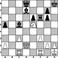 game notation in PGN-format [Event "wie w"] [Site "www.myChess.de"] [Date "2013.11.16"] [Round "1"] [White "Winston"] [Black "reisinger"] [ECO "C00"] [WhitemyELO "1550"] [BlackmyELO "1507"] [Result "1-0"] [TimeControl "10/1728000"] [WhiteDays "20"] [BlackDays "20"] [MyChessNo "91174"] 1. e4 e6 2. e5 d6 3. d4 dxe5 4. c3 exd4 5. cxd4 Nc6 6. Be3 Bb4+ 7. Nc3 Nf6 8. Be2 Ne4 9. Rc1 Nxc3 10. bxc3 Ba5 11. Bf3 Bd7 12. Ne2 O-O 13. O-O Ne7 14. Bxb7 Rb8 15. Be4 f5 16. Bc2 Ng6 17. Bb3 f4 18. Bd2 Kh8 19. f3 Bb6 20. Kh1 c5 21. dxc5 Bxc5 22. Bc2 Rb2 23. Bxg6 hxg6 24. Nxf4 Rf6 25. Nd3 Rxd2 26. Qxd2 a5 27. Ne5 1-0 position notation in FEN-format 3q3k/3b2p1/4prp1/p1b1N3/8/2P2P2/P2Q2PP/2R2R1K - - - 1 27 Captured white pieces: Captured black pieces: Click on a captured piece in order to display the desired move!