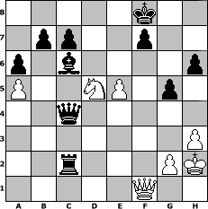 game notation in PGN-format [Event "Gegengambit"] [Site "www.myChess.de"] [Date "2014.07.25"] [Round "1"] [White "Winston"] [Black "borsti"] [ECO "D08"] [WhitemyELO "1403"] [BlackmyELO "1237"] [Result "0-1"] [TimeControl "10/2592000"] [WhiteDays "119"] [BlackDays "120"] [MyChessNo "95267"] 1. d4 d5 2. c4 e5 3. dxe5 Bb4+ 4. Bd2 Nc6 5. Bxb4 Nxb4 6. Qa4+ Nc6 7. Nc3 Be6 8. Rd1 Nge7 9. e4 d4 10. Nf3 O-O 11. Nb5 a6 12. Nbxd4 Qe8 13. Nxc6 Qxc6 14. Qc2 Rfd8 15. Bd3 h6 16. b3 Ng6 17. h3 Rd7 18. O-O Rad8 19. Rd2 Nf4 20. Rfd1 Nxd3 21. Rxd3 Qxe4 22. Qc1 Rxd3 23. Re1 Qc6 24. Nh2 Bf5 25. Nf1 Qg6 26. Kh1 Be4 27. Ng3 Bc6 28. Kh2 R8d4 29. Rf1 Rd2 30. a4 Qd3 31. Nf5 Rf4 32. Ne7+ Kf8 33. Nd5 Rfxf2 34. Rxf2 Rxf2 35. Nf4 Qxb3 36. a5 g5 37. Nd5 Rc2 38. Qf1 Qxc4 0-1 position notation in FEN-format 5k2/1pp2p2/p1b4p/P2NP1p1/2q5/7P/2r3PK/5Q2 - - - 0 39 Captured white pieces: Captured black pieces: Click on a captured piece in order to display the desired move!