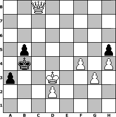 game notation in PGN-format [Event "Summer Games 2021"] [Site "www.myChess.de"] [Date "2021.08.01"] [Round "1"] [White "Seneca"] [Black "Master1"] [ECO "A45"] [WhitemyELO "1500"] [BlackmyELO "1333"] [Result "1-0"] [TimeControl "10/86400"] [WhiteDays "01"] [BlackDays "01"] [MyChessNo "122685"] 1. d4 Nf6 2. e3 d5 3. c4 e6 4. Nc3 Nc6 5. Nf3 Be7 6. a3 O-O 7. Be2 a6 8. c5 h6 9. O-O Re8 10. Qc2 Nd7 11. b4 Bf6 12. Bb2 Ne7 13. Rad1 c6 14. e4 e5 15. dxe5 Nxe5 16. exd5 cxd5 17. Nxe5 Bxe5 18. Nxd5 Nxd5 19. Bc4 Bxb2 20. Qxb2 Be6 21. Qb3 b5 22. Bxd5 Bxd5 23. Rxd5 Qc7 24. Rd1 Rad8 25. Rxd8 Rxd8 26. Rxd8+ Qxd8 27. g3 Qe7 28. Qd5 Kf8 29. Qa8+ Qe8 30. Qxe8+ Kxe8 31. f4 Kd7 32. Kf2 f5 33. Ke3 Kc6 34. Kd4 g6 35. Ke5 h5 36. h4 a5 37. Kf6 a4 38. Kxg6 Kd5 39. Kxf5 Kc4 40. c6 Kb3 41. c7 Kxa3 42. c8=Q Kxb4 43. Ke4 a3 44. Kd3 1-0 position notation in FEN-format 2Q5/8/8/1p5p/1k3P1P/p2K2P1/3P4/8 - - - 1 44 Captured white pieces: Captured black pieces: Click on a captured piece in order to display the desired move!
