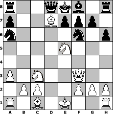 game notation in PGN-format [Event "2016"] [Site "www.myChess.de"] [Date "2016.01.01"] [Round "1"] [White "nyffhans"] [Black "hape50"] [ECO "B01"] [WhitemyELO "1939"] [BlackmyELO "1281"] [Result "1-0"] [TimeControl "10/2592000"] [WhiteDays "30"] [BlackDays "30"] [MyChessNo "101931"] 1. e4 d5 2. exd5 Qxd5 3. Nc3 Qe6+ 4. Be2 h6 5. Nf3 Nc6 6. d4 Nb4 7. d5 Qd7 8. a3 Na6 9. Ne5 Qd8 10. Bb5+ c6 11. Qf3 Nf6 12. dxc6 bxc6 13. Bxc6+ Bd7 14. Bxd7+ 1-0 position notation in FEN-format r2qkb1r/p2Bppp1/n4n1p/4N3/8/P1N2Q2/1PP2PPP/R1B1K2R - KQkq - 0 14 Captured white pieces: Captured black pieces: Click on a captured piece in order to display the desired move!