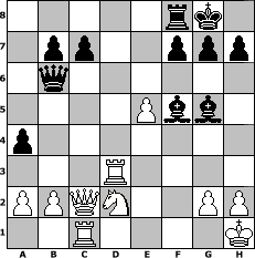 game notation in PGN-format [Event "Alapin-Diemer-Gambit Thematurnier"] [Site "www.myChess.de"] [Date "2010.01.23"] [Round "1"] [White "Kloetzchenschieber"] [Black "Koprek"] [ECO "C01"] [WhitemyELO "1758"] [BlackmyELO "1868"] [Result "0-1"] [TimeControl "10/2592000"] [WhiteDays "07"] [BlackDays "67"] [MyChessNo "62582"] 1. e4 e6 2. d4 d5 3. Be3 dxe4 4. Nd2 Nf6 5. f3 Nd5 6. Qe2 Nc6 7. c3 exf3 8. Ngxf3 Be7 9. Qf2 O-O 10. Bd3 e5 11. Nxe5 Nxe5 12. dxe5 Nxc3 13. Bc2 Nd5 14. O-O Nxe3 15. Qxe3 Qd5 16. Nb3 Qc6 17. Qe2 Be6 18. Kh1 Rad8 19. Rac1 Qb6 20. Bd3 a5 21. Qc2 a4 22. Nd2 Bg5 23. Rf3 Rxd3 24. Rxd3 Bf5 0-1 position notation in FEN-format 5rk1/1pp2ppp/1q6/4Pbb1/p7/3R4/PPQN2PP/2R4K - - - 1 25 Captured white pieces: Captured black pieces: Click on a captured piece in order to display the desired move!