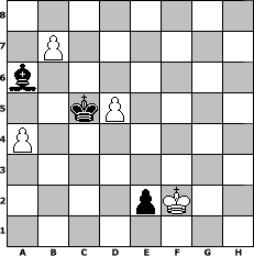 game notation in PGN-format [Event "960-Sommercup 2016"] [Site "www.myChess.de"] [Date "2016.06.10"] [Round "1"] [White "Erich"] [Black "larlinde"] [Variant "Fischerrandom"] [SetUp "1"] [FEN "qnrnbbkr/pppppppp/8/8/8/8/PPPPPPPP/QNRNBBKR w KQkq - 0 1"] [WhitemyELO "2115"] [BlackmyELO "2148"] [Result "1/2-1/2"] [TimeControl "10/2592000"] [WhiteDays "30"] [BlackDays "30"] [MyChessNo "103811"] 1. d4 d5 2. e3 b6 3. b3 c5 4. Be2 Bc6 5. Bc3 e5 6. Nd2 Ne6 7. Bb2 Nd7 8. Nf3 cxd4 9. exd4 e4 10. Nd2 h5 11. Ne3 Nf6 12. g3 h4 13. O-O-O b5 14. a3 a5 15. Kb1 Qa7 16. Ka2 g6 17. Rhg1 Bg7 18. Kb1 Qc7 19. Ka2 hxg3 20. hxg3 b4 21. a4 Rh2 22. Rdf1 Bb7 23. Rh1 Rxh1 24. Rxh1 Qb6 25. Rd1 Ne8 26. Bb5 Qd8 27. Bxe8 Qxe8 28. Ndf1 f5 29. Qc1 Qd7 30. Qd2 Ng5 31. Nh2 Kf7 32. Neg4 Ne6 33. Ne3 Ba6 34. f3 Ng5 35. f4 Ne6 36. g4 Nxf4 37. gxf5 gxf5 38. Rg1 Rh8 39. Qf2 Nh3 40. Rxg7+ Kxg7 41. Qg3+ Kf7 42. Qe5 Re8 43. Nhg4 fxg4 44. Qh5+ Kg7 45. Nf5+ Kf6 46. Ne3 Qf7 47. Nxg4+ Ke7 48. Qxh3 Kd8 49. Bc1 Kc7 50. Ne5 Qe6 51. Qh7+ Re7 52. Qh8 Kb6 53. Qd8+ Rc7 54. Kb1 Qc8 55. Qxd5 Rxc2 56. Bf4 Ka7 57. Be3 Rc3 58. Bd2 e3 59. Bxc3 Qxc3 60. Nc6+ Kb6 61. Qxa5+ Kb7 62. Qxb4+ Qxb4 63. Nxb4 e2 64. Nc2 Bd3 65. Kc1 Bxc2 66. Kd2 Bd3 67. b4 Bc4 68. d5 Kb6 69. Ke1 Kc7 70. b5 Bd3 71. Kd2 Bc4 72. Ke1 Kd6 73. b6 Ba6 74. Kf2 Kc5 75. b7 1/2-1/2 position notation in FEN-format 8/1P6/b7/2kP4/P7/8/4pK2/8 - - - 0 75 Captured white pieces: Captured black pieces: Click on a captured piece in order to display the desired move!