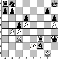 game notation in PGN-format [Event "> 1500"] [Site "www.myChess.de"] [Date "2010.03.18"] [Round "1"] [White "commander"] [Black "crca108"] [ECO "A43"] [WhitemyELO "1172"] [BlackmyELO "1425"] [Result "0-1"] [TimeControl "10/2592000"] [WhiteDays "003"] [BlackDays "118"] [MyChessNo "64061"] 1. d4 c5 2. d5 Nf6 3. c4 h6 4. b3 Qb6 5. Bd2 Ne4 6. h4 Qf6 7. Be3 Qxa1 8. f3 Ng3 9. Rh3 Nxf1 10. Kxf1 d6 11. g4 Qxa2 12. Nc3 Qa5 13. Bd2 Qd8 14. h5 e6 15. e4 exd5 16. exd5 Qf6 17. Rh2 Bxg4 18. Ne4 Qf5 19. Ng3 Qd3+ 20. Kf2 Bd7 21. Rh4 Be7 22. Re4 f5 23. Re3 Qd4 24. Qe1 Qf6 25. Bc3 Qh4 26. N1e2 O-O 27. Kg2 f4 28. Qd2 Bh3+ 29. Kf2 fxe3+ 30. Qxe3 Bg4 31. Ng1 Qh2+ 32. Kf1 Bh4 33. N3e2 Bh3+ 34. Nxh3 Qxh3+ 35. Kg1 Kh8 36. b4 Bg5 37. Qf2 Rxf3 38. Qe1 Be3+ 39. Qf2 Bxf2# 0-1 position notation in FEN-format rn5k/pp4p1/3p3p/2pP3P/1PP5/2B2r1q/4Nb2/6K1 - - - 0 40 Captured white pieces: Captured black pieces: Click on a captured piece in order to display the desired move!