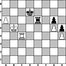game notation in PGN-format [Event "In Memorium Michael Knopf"] [Site "www.myChess.de"] [Date "2012.04.10"] [Round "1"] [White "faustballer"] [Black "reisinger"] [ECO "C00"] [WhitemyELO "1513"] [BlackmyELO "1466"] [Result "1-0"] [TimeControl "10/2592000"] [WhiteDays "210"] [BlackDays "210"] [MyChessNo "81100"] 1. e4 e6 2. Bc4 d5 3. exd5 exd5 4. Bb3 Nf6 5. h3 Nc6 6. Nf3 Bc5 7. d4 Bb6 8. Be3 O-O 9. c3 a6 10. O-O Re8 11. Nbd2 h6 12. Ba4 Bd7 13. b4 Ne7 14. Bxd7 Qxd7 15. a4 Nf5 16. Re1 Ne4 17. Nxe4 dxe4 18. Ne5 Qd5 19. c4 Qd8 20. Qb3 Bxd4 21. Rad1 Nxe3 22. fxe3 Rxe5 23. exd4 Rg5 24. Rxe4 Qf6 25. Rf1 Qg6 26. Re2 Rd8 27. d5 Rd7 28. Ref2 Kh8 29. Qe3 Rd8 30. Qe7 Rd6 31. Qxf7 Rf6 32. Qxg6 Rfxg6 33. Re1 c6 34. Re8+ Kh7 35. dxc6 Rxc6 36. c5 b6 37. cxb6 Rxb6 38. Rb2 Rf5 39. Re4 Rd5 40. a5 Rbd6 41. Kh2 Kg6 42. Rbe2 Kf6 43. h4 Rd4 44. Rf2+ Kg6 45. Rfe2 Kf5 46. g4+ Kg6 47. Re6+ Kh7 48. Rxd6 Rxd6 49. Re4 Rf6 50. Kg3 Kg6 51. Re5 Kh7 52. b5 axb5 53. Rxb5 Ra6 54. Kf4 g6 55. Ke5 Kg7 56. Kd5 h5 57. g5 Kf7 58. Kc4 Ke7 59. Kb4 Re6 60. Rc5 Kd7 61. Kb5 Re4 62. Rc4 Re5+ 63. Kb4 Re6 64. Ka4 Kd8 65. Kb5 Kd7 66. a6 1-0 position notation in FEN-format 8/3k4/P3r1p1/1K4Pp/2R4P/8/8/8 - - - 0 66 Captured white pieces: Captured black pieces: Click on a captured piece in order to display the desired move!