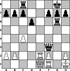 game notation in PGN-format [Event "startup 2006"] [Site "www.myChess.de"] [Date "2006.01.01"] [Round "1"] [White "icke"] [Black "Stoertebecker"] [ECO "A40"] [WhitemyELO "1384"] [BlackmyELO "1631"] [Result "0-1"] [TimeControl "10/3456000"] [WhiteDays "40"] [BlackDays "33"] [MyChessNo "21292"] 1. d4 Nc6 2. d5 Ne5 3. Nc3 e6 4. e4 Nf6 5. Nf3 Nxf3+ 6. gxf3 exd5 7. exd5 Bb4 8. Bd2 O-O 9. Ne2 Nxd5 10. Bh3 Re8 11. c4 Nf4 12. O-O Nxe2+ 13. Kg2 Bxd2 14. Qxd2 d6 15. Bxc8 Rxc8 16. Rae1 Re6 17. Rxe2 Rg6+ 18. Kh1 Qf6 19. Qe1 Qxf3# 0-1 position notation in FEN-format 2r3k1/ppp2ppp/3p2r1/8/2P5/5q2/PP2RP1P/4QR1K - - - 0 20 Captured white pieces: Captured black pieces: Click on a captured piece in order to display the desired move!