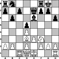 game notation in PGN-format [Event "Godzilla Open - Gruppe B"] [Site "www.myChess.de"] [Date "2014.04.01"] [Round "1"] [White "deepsabel"] [Black "nyffhans"] [ECO "D59"] [WhitemyELO "2040"] [BlackmyELO "2037"] [Result "1-0"] [TimeControl "10/2592000"] [WhiteDays "29"] [BlackDays "14"] [MyChessNo "93807"] 1. d4 d5 2. c4 e6 3. Nc3 Nf6 4. Bg5 Be7 5. e3 O-O 6. Nf3 h6 7. Bh4 b6 8. cxd5 Nxd5 9. Bxe7 Qxe7 10. Nxd5 exd5 11. Rc1 Be6 12. Bd3 1-0 position notation in FEN-format rn3rk1/p1p1qpp1/1p2b2p/3p4/3P4/3BPN2/PP1P1PPP/2RQK2R - K - 3 12 Captured white pieces: ![]() ![]() ![]() ![]() ![]() ![]() ![]() ![]() ![]() ![]() ![]() ![]() ![]() ![]() ![]() Captured black pieces: ![]() ![]() ![]() ![]() ![]() ![]() ![]() ![]() ![]() ![]() ![]() ![]() ![]() ![]() ![]() Click on a captured piece in order to display the desired move!