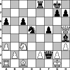 game notation in PGN-format [Event "Drachenboote auf dem Rhein"] [Site "www.myChess.de"] [Date "2009.07.15"] [Round "1"] [White "neve"] [Black "Jolilein"] [ECO "B01"] [WhitemyELO "1516"] [BlackmyELO "1802"] [Result "0-1"] [TimeControl "10/1728000"] [WhiteDays "20"] [BlackDays "20"] [MyChessNo "57493"] 1. e4 d5 2. exd5 Nf6 3. c4 c6 4. d4 cxd5 5. Nc3 Nc6 6. Nf3 Bg4 7. cxd5 Nxd5 8. Bb5 e6 9. h3 Bxf3 10. Qxf3 a6 11. Bxc6+ bxc6 12. a3 Be7 13. O-O O-O 14. Re1 Qb6 15. Qg4 f5 16. Qg3 Qxd4 17. Rxe6 Bh4 18. Qf3 Rae8 19. Rxe8 Rxe8 20. Qh5 Qxf2+ 0-1 position notation in FEN-format 4r1k1/6pp/p1p5/3n1p1Q/7b/P1N4P/1P2PqP1/R1B3K1 - - - 0 21 Captured white pieces: Captured black pieces: Click on a captured piece in order to display the desired move!
