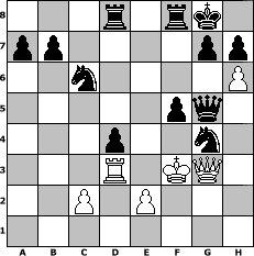game notation in PGN-format [Event "Gary COME BACK Turnier"] [Site "www.myChess.de"] [Date "2005.03.18"] [Round "1"] [White "Hobbykegler"] [Black "Joschi"] [ECO "A15"] [WhitemyELO "1114"] [BlackmyELO "1601"] [Result "0-1"] [TimeControl "10/1728000"] [WhiteDays "14"] [BlackDays "18"] [MyChessNo "11256"] 1. c4 Nf6 2. d4 c5 3. dxc5 Qa5+ 4. Bd2 Qxc5 5. Be3 Qxc4 6. Nd2 Qc7 7. Rc1 Nc6 8. g3 e6 9. Ngf3 d5 10. Bh3 Be7 11. O-O O-O 12. Ng5 e5 13. f4 Bxh3 14. Rf2 Be6 15. Nxe6 fxe6 16. Nf3 exf4 17. Bxf4 Bd6 18. Qd3 Bxf4 19. gxf4 Qb6 20. Kf1 Ne4 21. Rg2 Qxb2 22. Qe3 Qf6 23. f5 exf5 24. Rd1 d4 25. Qf4 Rad8 26. h4 Nc3 27. Rd3 Nxa2 28. Ng5 Nc3 29. h5 Nd5 30. Qh4 Ne3+ 31. Kf2 Nxg2 32. Qg3 Ne3 33. h6 Ng4+ 34. Kf3 Qxg5 0-1 position notation in FEN-format 3r1rk1/pp4pp/2n4P/5pq1/3p2n1/3R1KQ1/2P1P3/8 - - - 0 35 Captured white pieces: Captured black pieces: Click on a captured piece in order to display the desired move!